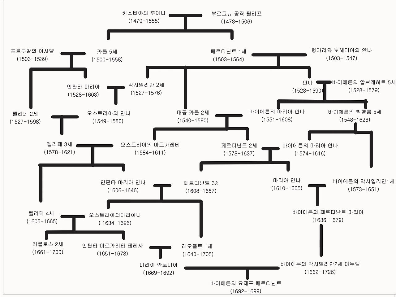 합스부르크 가문이라고 하면 근친 결혼을 떠올리는 분들이 많을 것입니다. 사실 합스부르크 가문이 근친결혼의 대명사가 된 것은 결혼 관계를 통해서 부르고뉴 공작령은 물론 에스파냐 지역을 얻게 되는 때부터 였습니다. 이 거대한 영지를 한명의 군주가 통제하기 힘들었고 결국 황제 카를 5세는 좀 더 부유한 지역이었던 에스파냐와 부르고뉴 공작령은 아들인 펠리페 2세에게 물려줬고, 이미 총독으로 오스트리아 지역을 통치하고 있던 동생인 페르디난트에게 그대로 오스트리아 지역과 제국의 황위를 물려주었던 것입니다. 그리고 이렇게 두 개로 나뉜 가문은 서로의 이익을 위해서 지속적으로 통혼을 하게 되었고 그렇기에 근친결혼이 심해지게 되는 것입니다.