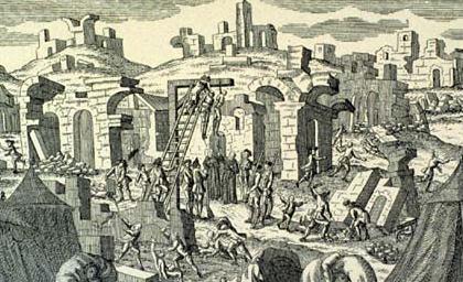 지진후 약탈을 일삼을 사람들을 교수형에 처하는 모습