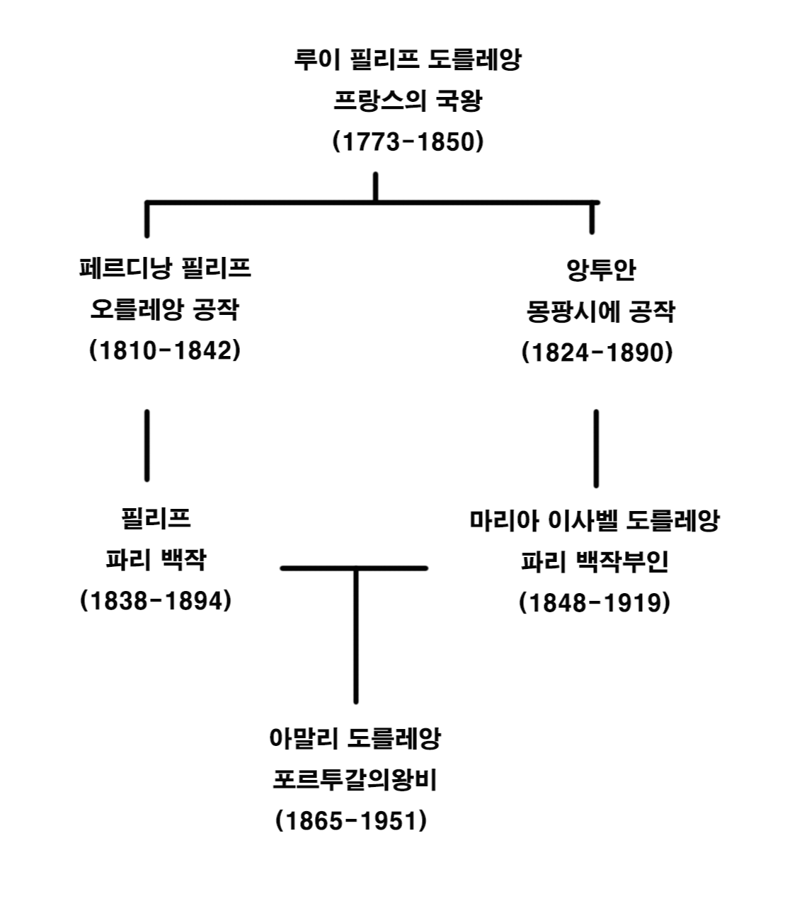 오를레앙의 아멜리는 파리 백작 필리프와 그의 아내인 마리아 이사벨 도를레앙의 딸로 태어났습니다. 아멜리의 아버지인 필리프는 오를레앙 가문의 수장으로 오를레앙 공작으로 프랑스의 국왕이 되었던 루이 필리프의 손자였습니다. 아멜리의 할아버지이자 파리 백작의 아버지였던 페르디낭 필리프는 루이 필리프의 장남으로 프랑스내에서 인기있었던 인물이기도 했습니다. 하지만 그는 마차 사고로 아버지 보다 미리 사망했고 그가 죽은 뒤 결국 루이 필리프는 왕위에서 쫓겨나게 되었습니다.