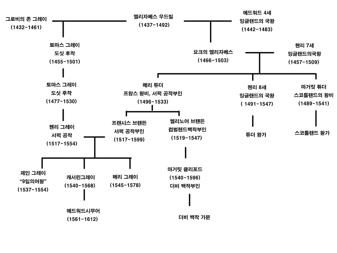 결혼후 레이디 제인 더들리로도 알려지게 되지만 결혼 전 이름이 더 잘 알려진 레이디 제인 그레이는 서퍽 공작 헨리 그레이와 그의 아내인 레이디 프랜시스 브랜든의 첫 번째 딸로 태어났습니다. 헨리 그레이는 도싯 후작 토마스 그레이의 아들로, 그의 증조할머니는 바로 엘리자베스 우드빌이었습니다. 엘리자베스 우드빌과 그녀의 첫 번째 남편인 존 그레이 경 사이에서 태어난 도싯 후작 토마스 그레이가 바로 헨리 그레이의 할아버지였습니다.