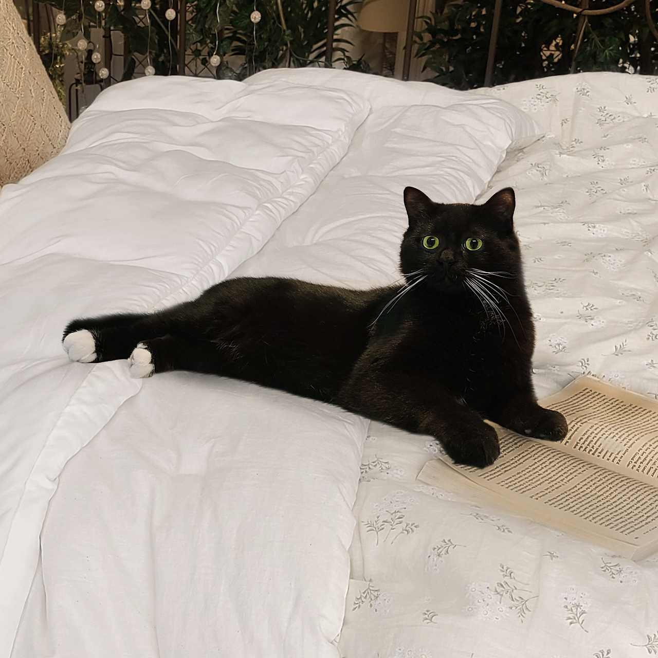 저는 아침에 일어나면 이렇게 책부터 펼쳐놓고 사색에 잠겨요. 만으로 딱 두 살이 되던 때부터 하루도 빼먹지 않고 독서를 하고 있답니다. 고양이가 책을 읽는다고 너무 이상하게 생각하지는 않았으면 해요. 우리가 생각보다 영리하다는 건 다들 이미 잘 알고 계시잖아요?
