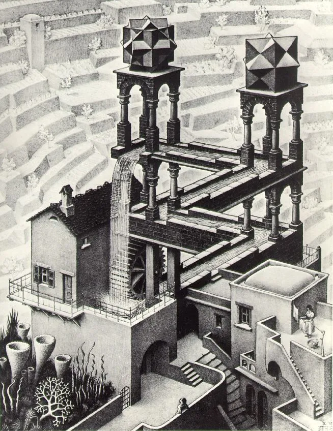 에셔의 <폭포>. ARTCHIVE<미학 오디세이>가 <괴델, 에셔, 바흐>와 가장 밑바탕에서('후경 분열의 법칙'에 따르자면 '이념의 층위'에서) 공통적으로 공유하고 있는 것은 '숭고'다. 숭고는, 저자를 인용하면, "인간은 알지 못하게 되어 있는 미"다. 그런데, '미'란 것을 인간이 알고 있기는 한가? 저자의 설명을 따라가다 보면 미 그 자체도 인간이 알지 못하고 있다는 의혹이 강하게 든다. "미란? 미적 지각의 대상. 미적 지각은? 미에 대한 지각! 예술이란? 예술계가 자격을 부여한 대상. 예술계는? 예술에 자격을 부여하는 세계" <괴델, 에셔, 바흐>에서 호프스태터가 강조한 것도 이런 '이상한 고리'다. 괴델의 불완전성 정리, 에셔의 판화 <폭포>, 바흐의 <무한 상승 카논> 등과 같이, 계단을 오르다 보면 어느새 출발지점으로 돌아오고 마는 기이한 고리. <괴델, 에셔, 바흐>에서는 이런 '이상한 고리'를 통하여 인간의 마음의 불가해성을 은유하고 <미학 오디세이>에서는 미의 불가해성을 은유한다. 둘 모두 뫼비우스적 비틀림을 적용한 피드백이 궁극의 진리라고 소곤댄다. 컴퓨터 과학자 호프스태터는 정중하게, 미학-철학자 진중권은 다소 불온하게. 그런 측면에서 어찌 보면 <미학 오디세이>의 숭고함이 <괴델, 에셔, 바흐>의 그것보다는 훨씬 인간적이고 매력적이다. 어차피 숭고할 바에는 번듯하고 깔끔하게 숭고한 것보다는 삐딱하고 기괴하게 숭고한 쪽이 더 멋지잖은가? 그래서인지 저자는 <미학 오디세이> 3권을, 다소 말쑥한 에셔나 마그리트류의 초현실이 아닌, 피라네시의 깊고 음울한 초현실로 두텁게 회칠한다. 그리고는 숭고하고 영원한 황금실이 무참히 파괴해 버리고 남은 미의 원형의 폐허로 냉소적이며 얄궂은 미소를 머금고 회귀한다.