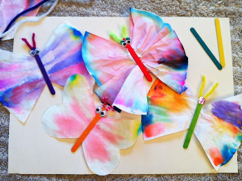 4. 다 마른 커피 필터 두 개를 아이스크림 바에 나비의 날개 모양으로 붙입니다.