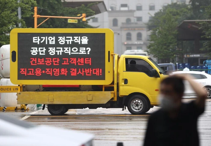 서울 여의도 한 호텔 앞 건강보험공단 직원들의 시위트럭의 모습. ⓒ 연합뉴스