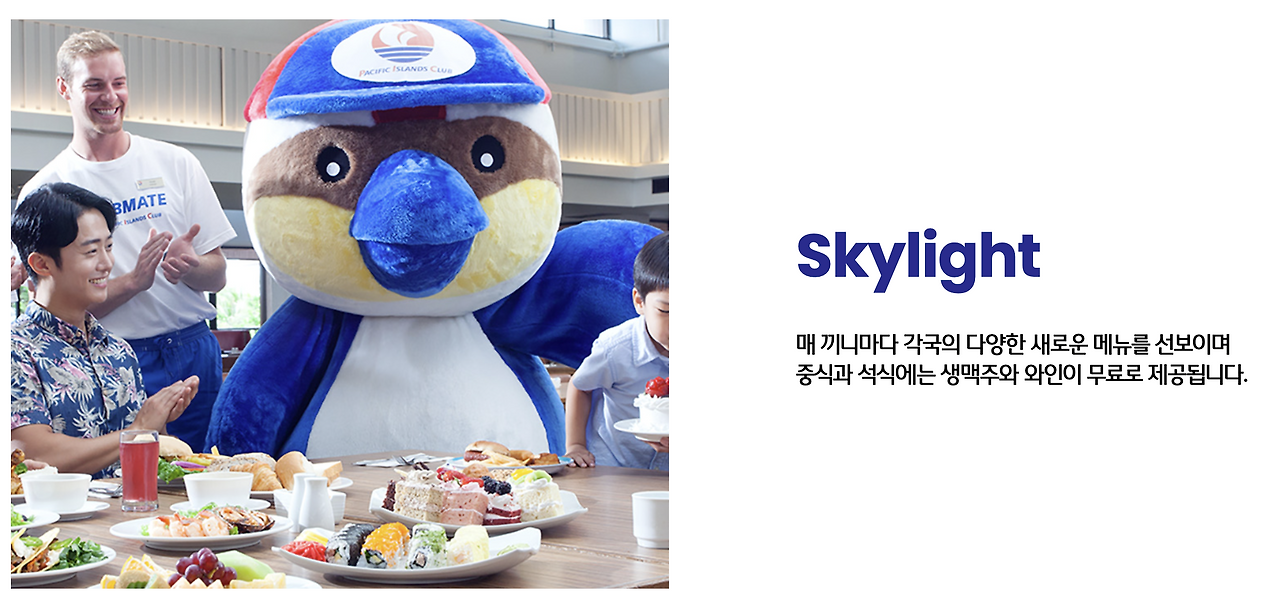 수학여행 대식당 분위기의 뷔페에서의 느낌은 달랐다. 그리고 무엇보다 가장 큰 차이점은 스카이라이트에 근무하는 직원들의 모습이었다. 모두 하나같이 아이들에게 밝고 따듯하게 대한다. 식사와 동시에 Let's Speak English 프로그램을 체험할 수 있고, 꼭 그렇지 않다 하더라도 기본적으로 직원들이 아이들을 대하는 에너지와 표정이 밝고 적극적이다.