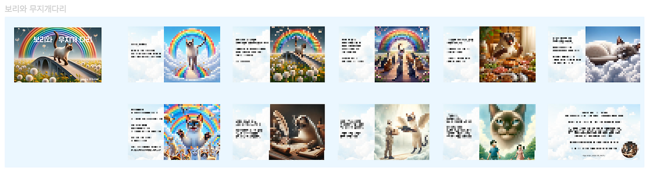 Midjourney와 Dall-e 등 몇 가지 모델로 샴고양이 보리를 그려냈다. 우려했던 대로 그림체의 일관성이 걸림돌이었다. 최소한 보리만이라도 동일한 객체로 그려지길 바랐지만 많은 부분에서 디테일이 아쉬움이 느껴졌다. –cref 파라미터를 사용해서 보리의 모습을 유지하면, 의외의 부분이 어긋나거나, 배경 스타일을 유지시키면 보리의 모습이 바뀌곤 했다. 물론 좀 더 많은 리서치와 시도를 했다면 개선이 가능했지만, 당시에는 하루 만에, 정확히 말하면 나에게 주어진 약 3시간 안에, 우주에게 책을 보여주고 싶다는 압박에 사로잡혀 충분한 시도를 하지 못했다.