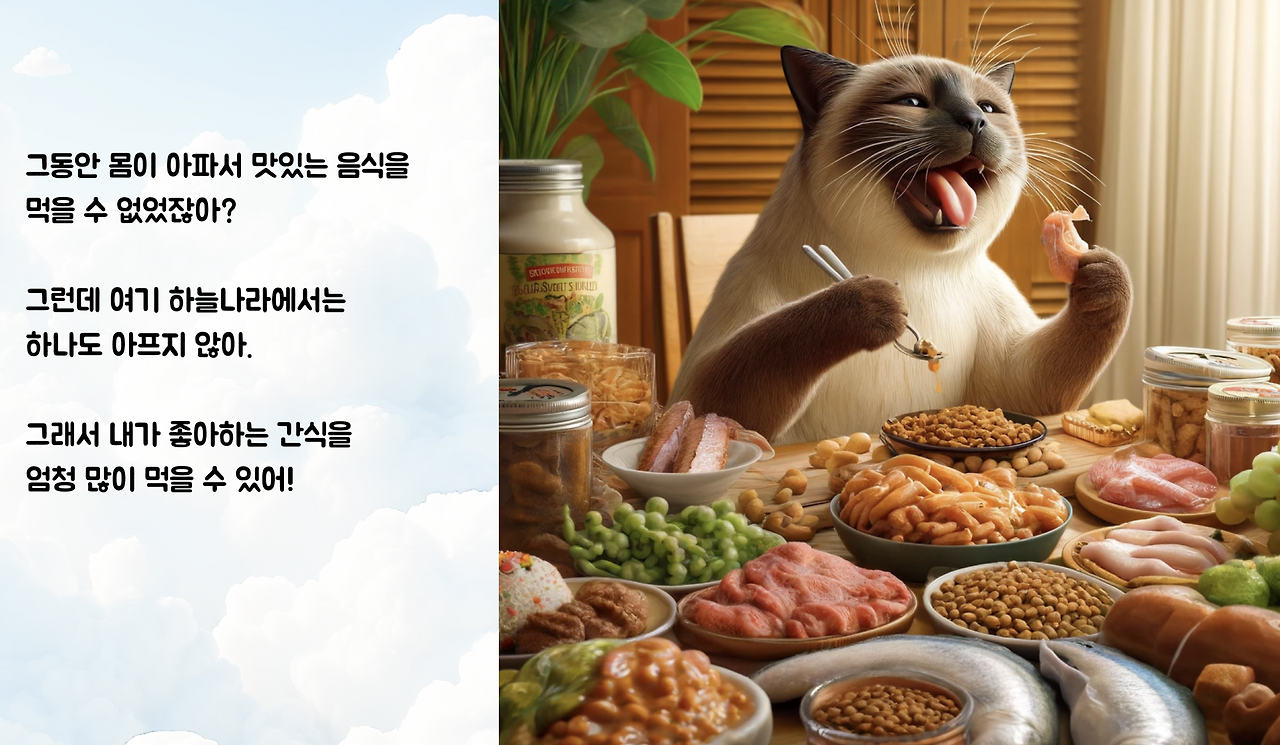 3. 무지개다리를 건너고 고양이 친구들을 만나는 보리.