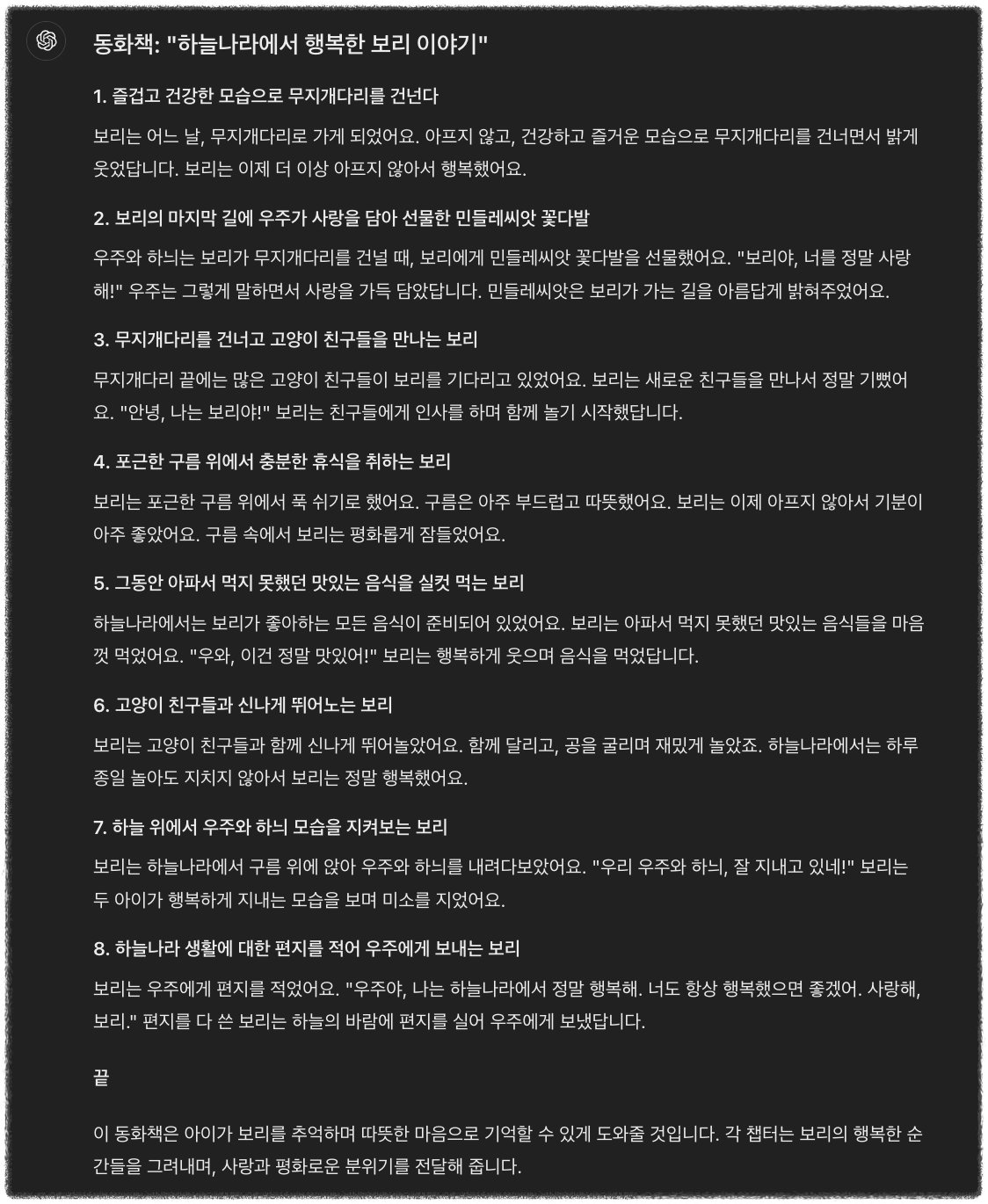 챕터를 구성하고 chatGPT와 Claude를 사용해 이야기에 살을 붙여봤다. 장황하고 구체적인 내용의 동화가 만들어졌다. 프롬프트를 바꿔가며 가다듬어도 우주를 위한, 우주에게 적합한, 우주가 진심으로 공감할 내용으로 보이지 않았다. 엔터를 누를 때마다 그럴싸한 동화 이야기가 만들어졌다. 어디 내놔도 손색없을 내용이었지만 내 마음에 들진 않았다.