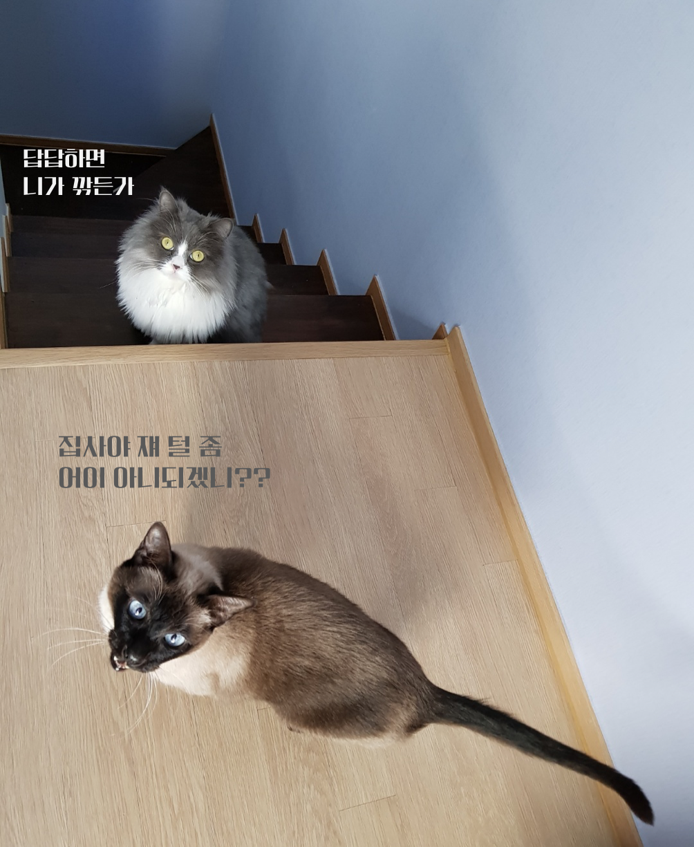"방 안에 단 둘이 있을 때는 우다다 좀 자제하고, 집사녀석들 있을 때만 뛰 노는건 어때?"