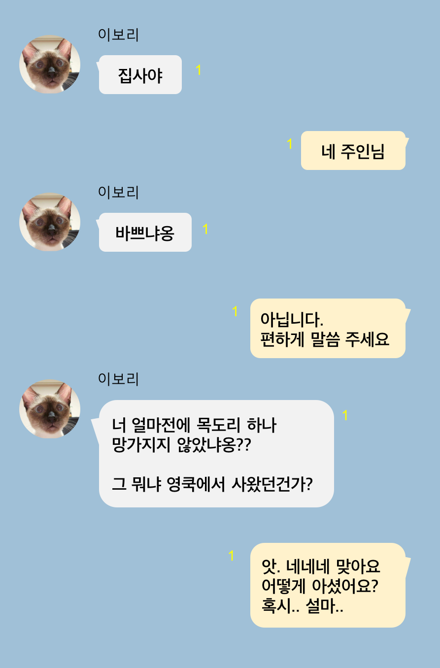그 목도리로 말할 것 같은면..집사가 영쿡 생활할 때 여집사한테 선물 받은 목도리로, 잘은 모르겠지만 엄청 아끼는 거고, 추억도 꽤 많이 묻어있는 걸로 알고 있는데..