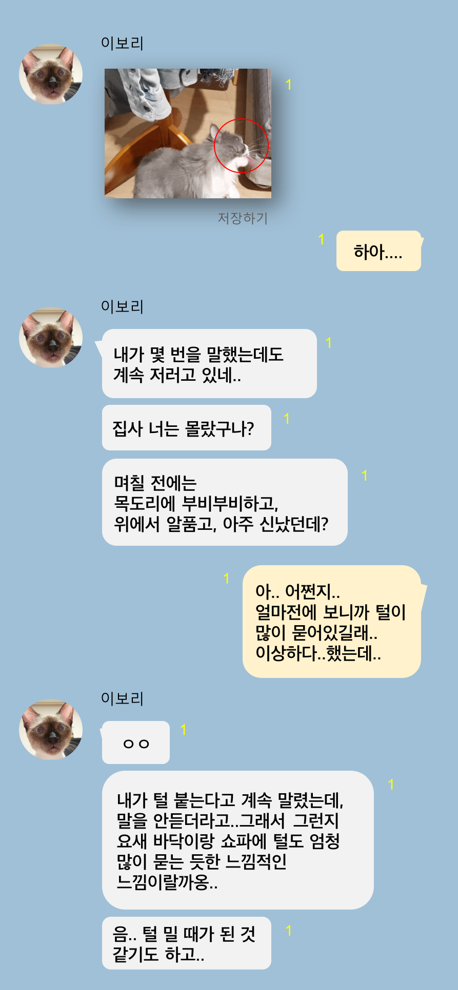 하지만 이구름은 내 제안에 눈하나 깜빡 안하고 시도때도 없이 털을 뿜어대며 뛰어다니기 바빴다.