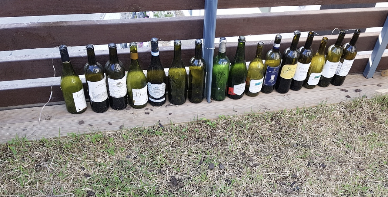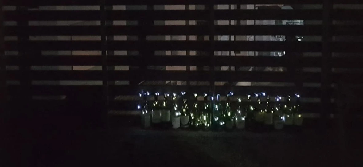 처음에는 와인병을 원형으로 배치해봤다가, 울타리에도 걸어봤다가, 눕혀도보고..별 시도를 다 해봤는데 그냥 저렇게 일렬로 세워놓고 병 당 전구 5-10개씩 넣어둔 게 가장 이쁘더라.