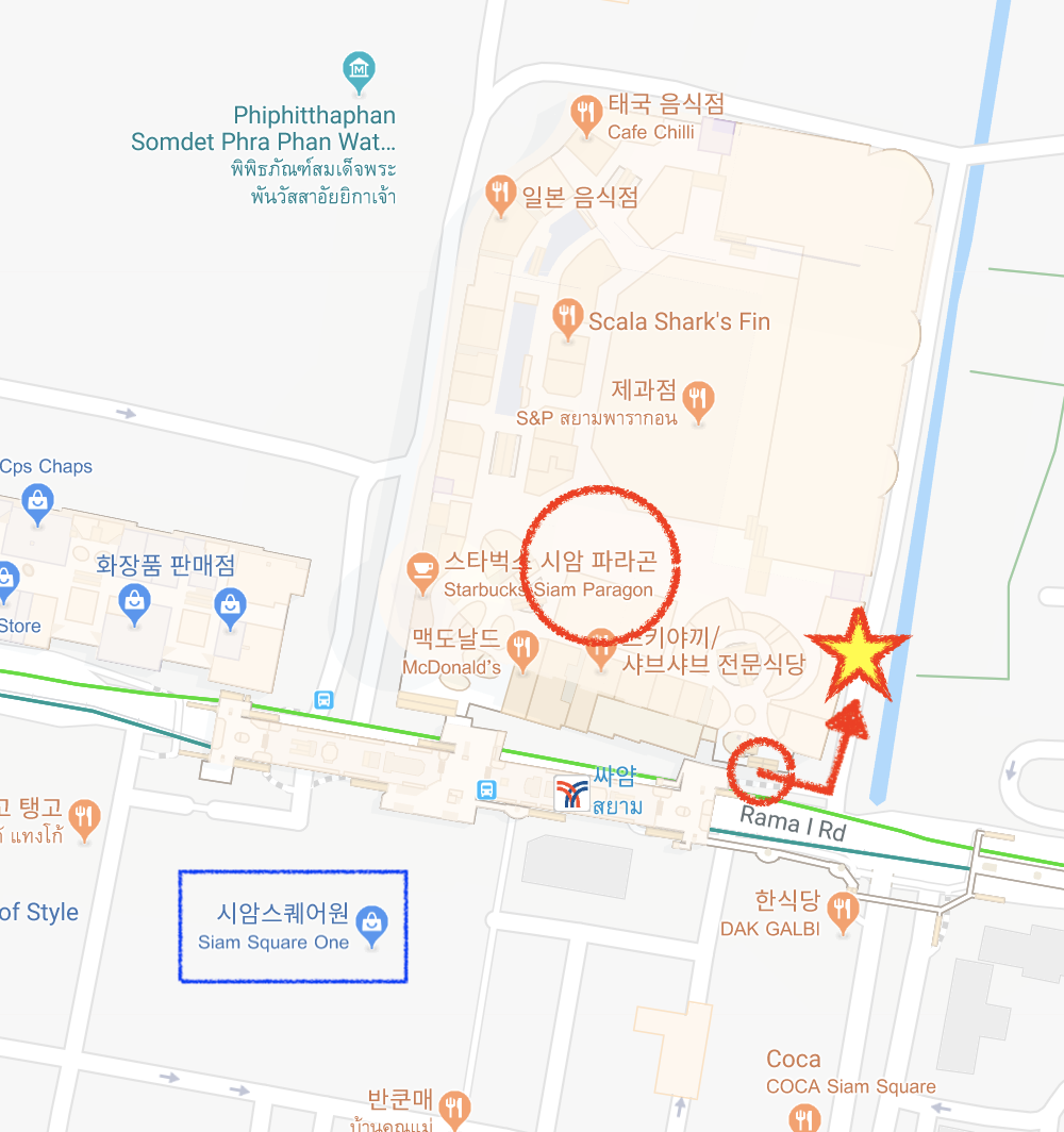 SIAM PARAGON(아래 이미지 붉은 원)은 시암을 대표하는 쇼핑센터 중 하나로 한국의 현대백화점 느낌이 물씬 풍기는 곳이다.