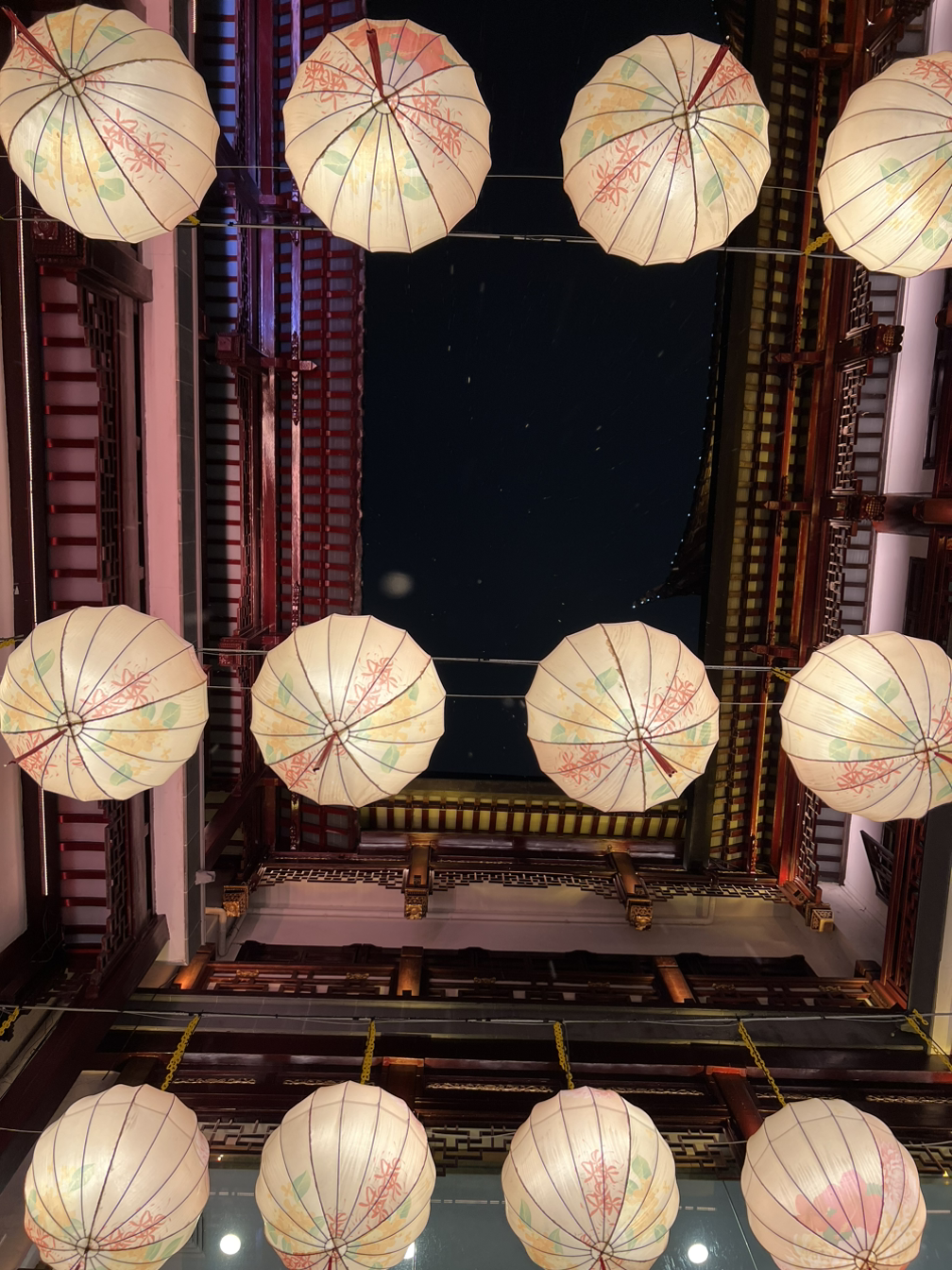 고개를 들어 하늘을 보면 달을 닮은 아름다운 등이 화려한 예원의 붉은빛을 은은하게 감싼다