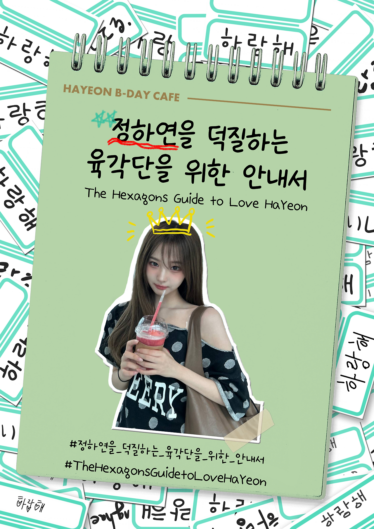결국 생일 카페를 여는 것도, 팬들이 생일 카페를 찾는 것도 ‘내 아이돌’을 위해서 하는 것이라, 그 진심을 표현하고 싶었다. 이 생각을 가지고, 이 생일 카페의 컨셉을 정했으며, 포스터에도 ‘하랑해’가 적힌 견출지 모양 에셋을 잔뜩 붙였다. 손글씨 모양의 폰트를 쓰기도 했지만, 직접 Procreate를 활용해 애플 펜슬로 직접 ‘하랑해’를 작성했다. 그리고 생일 카페에 오기 어려운 해외 팬들도 한글을 모르는 와중에 ‘하랑해’를 그렸다.