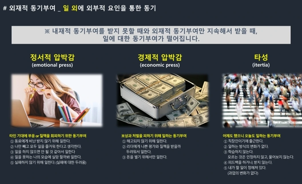 보상과 처벌을 피하기 위해 일하는 동기부여입니다. 아래 3가지 항목에 의해 일을 하고 있다면 정말 힘든 시간을 보내고 있을지도 모릅니다.
