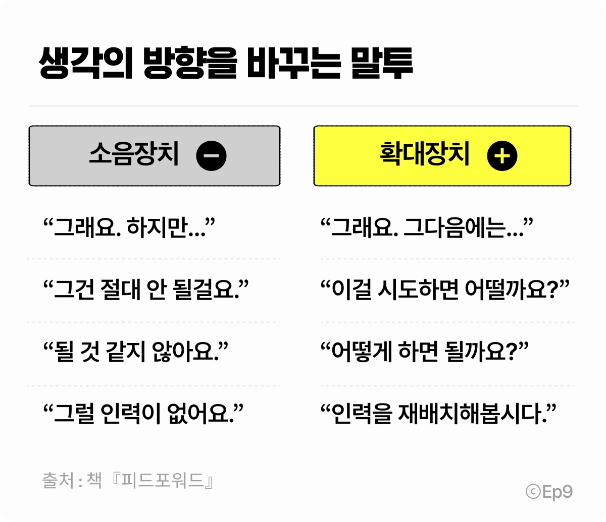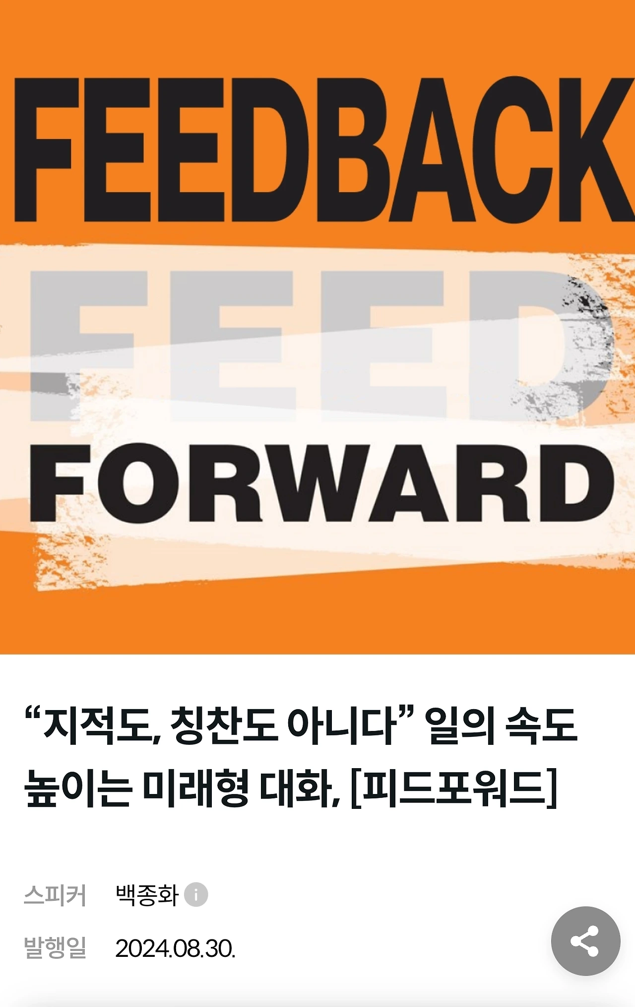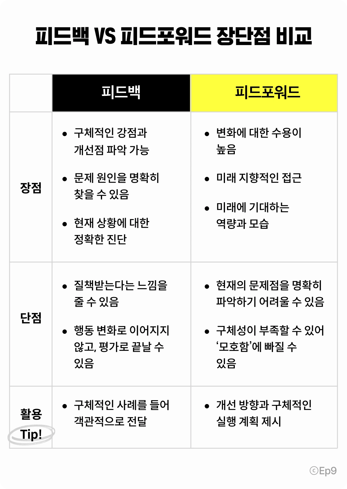 오늘의 키워드는 피드포워드Feedforward야. ‘미래에 더 나은 결과를 얻는 대화’를 뜻해. 우리가 잘 아는 피드백Feedback과 다른 거냐고? 방향이 조금 달라. 피드백은 과거의 일을 회고하며 개선점을