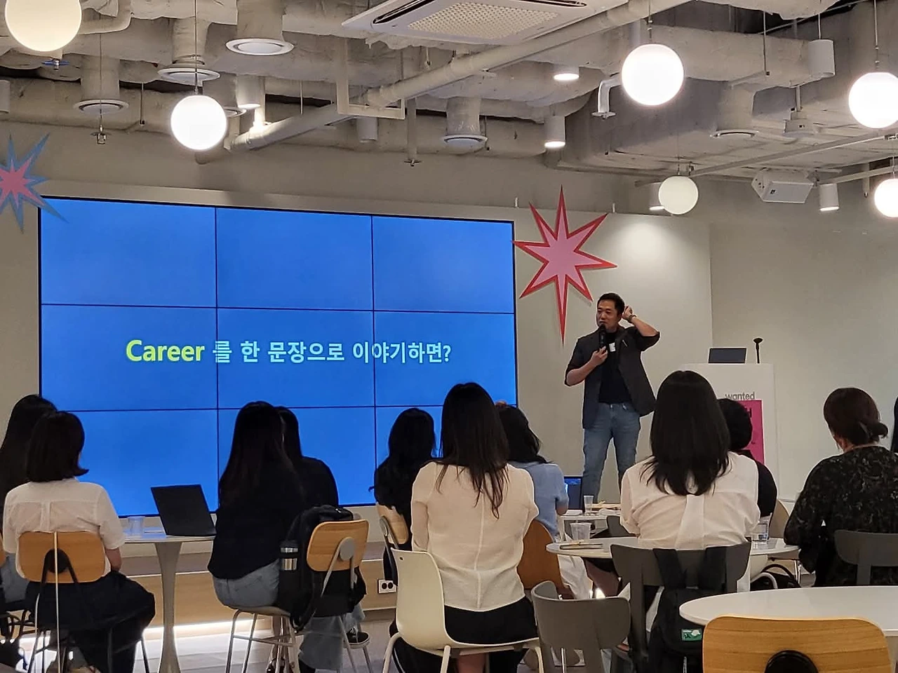 누군가에게 내 커리어를 온전하게 공유하는 것은 참 어렵습니다. 내 커리어를 똑같이 따라할 수 있는 사람도 없고, 동의하지 않는 사람들도 있을 테니까요. 그리고 번아웃, 실패, 깊은 골짜기에 빠진 이야기 등등 어려웠던 이야기를 할 수 밖에는 없기도 하거든요. 그럼에도 불구하고, 누군가에게 작은 방향성을 줄 수 있다면 '성장을 돕는 코치' 로서의 작은 의미를 얻을 수는 있으니 진심으로 이야기를 꺼내봤습니다. 나름 많이 내향형이라 내 이야기를 잘 하지 못하는데, 지금까지 어디에서도 이야기하지 않았던 이야기들도 꺼내게 되었고요. 그만큼 모인 분들의 에너지가 남다르더라고요.
