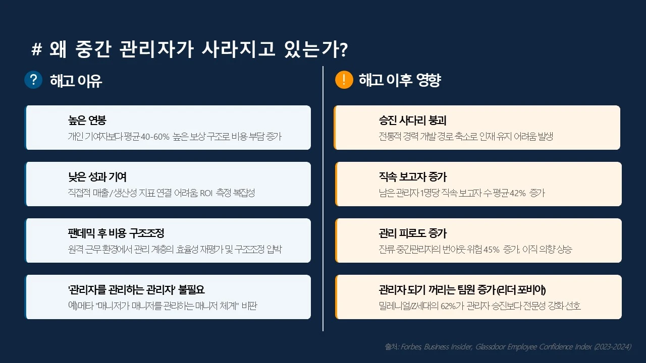 "중간관리자 감축은 일시적 트렌드가 아닌 구조적 변화의 신호입니다. 이는 '누가 관리하는가'가 아닌 '어떻게 일하는가’ ‘관리자의 성과는 무엇인가’에 대한 근본적인 역할 재정의가 필요한 시점입니다."