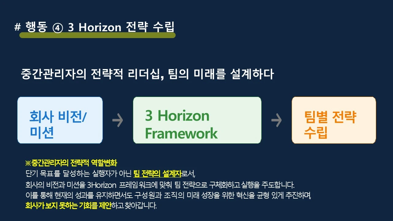 마지막으로 회사의 비전 / 미션과 얼라인 된 전략 수립을 할 수 있어야 한다는 메시지를 전했는데요. 제게 가장 익숙한 3 HORIZON 사례를 공유하며 중간관리자의 전략적 역할이 '단기 목표를 달성하는 실행자가 아닌 팀 전략의 설계자로서, 회사의 비전과 미션을 3Horizon 프레임 워크에 맞춰 팀 전략으로 구체화하고 실행을 주도합니다. 이를 통해 현재의 성과를 유지하면서도 구성원과 조직의 미래 성장을 위한 혁신을 균형 있게 추진하며, 회사가 보지 못하는 기회를 제안하고 찾아가야 합니다.'