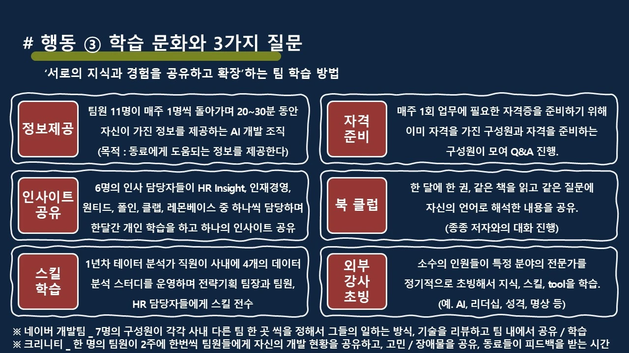 혼자서 자신의 일을 하는 것이 아니라, 서로의 고민과 지식을 공유하는 학습 문화를 만드는 것이 필요하다는 제안을 했습니다. 동료와 협력하여 내 성과 뿐만 아니라 다른 사람의 성공에 기여하는 리더십과 조직문화 말이죠.