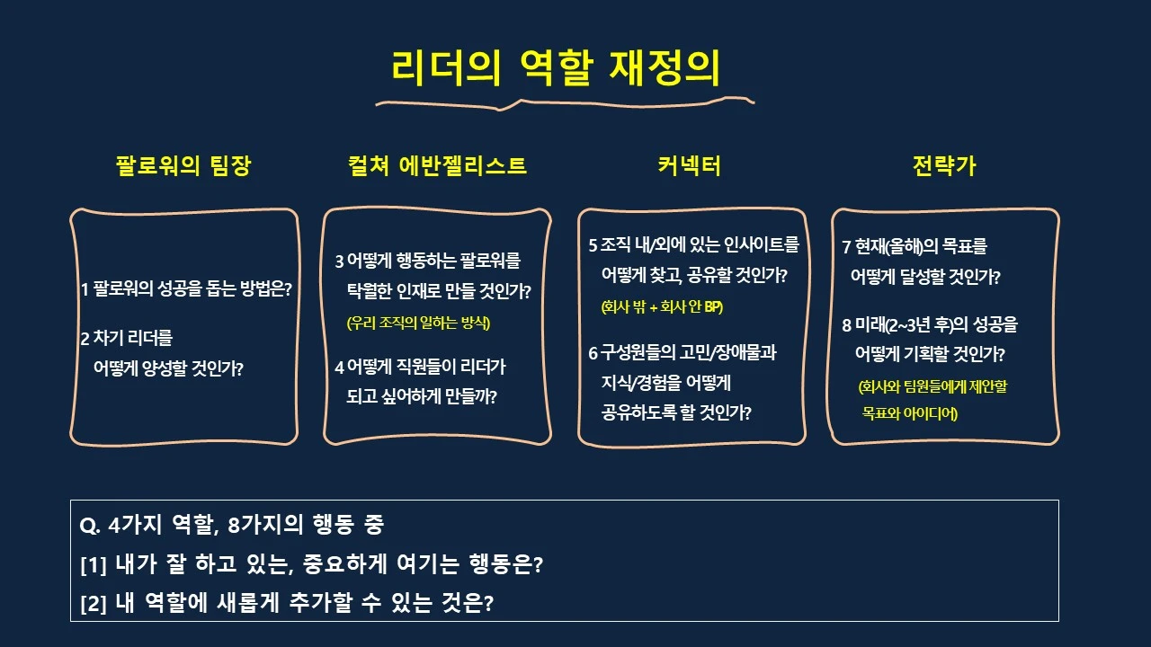 이제 중간 관리자의 역할은 재정의 되어야 합니다. 특히, 우리나라에서는 말이죠. 임원의 지시를 실행하는 관리자가 아닌 스스로 전략을 수립할 수 있어야 하고, 목표만 바라보는 것이 아니라 구성원 개개인의 성장을 바라볼 수 있어야 합니다. 스스로 성장하며 동기부여 되는 모습을 보여주며 누군가의 롤모델이 될 수 있어야 하고, 조직의 일하는 모습을 계획하고 만들어 가는 컬쳐 플래너이나 전도사가 되어야 하죠.