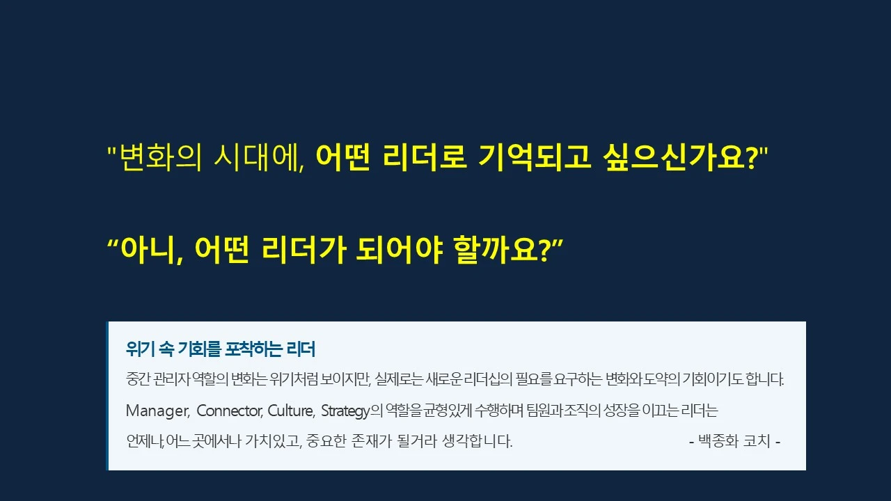 중간 관리자 역할의 변화는 위기처럼 보이지만, 실제로는 새로운 리더십의 필요를 요구하는 변화와 도약의 기회이기도 합니다. Manager, Connector, Culture, Strategy의 역할을 균형있게 수행하며 팀원과 조직의 성장을 이끄는 리더는 언제나, 어느 곳에서나 가치있고, 중요한 존재가 될거라 생각합니다.