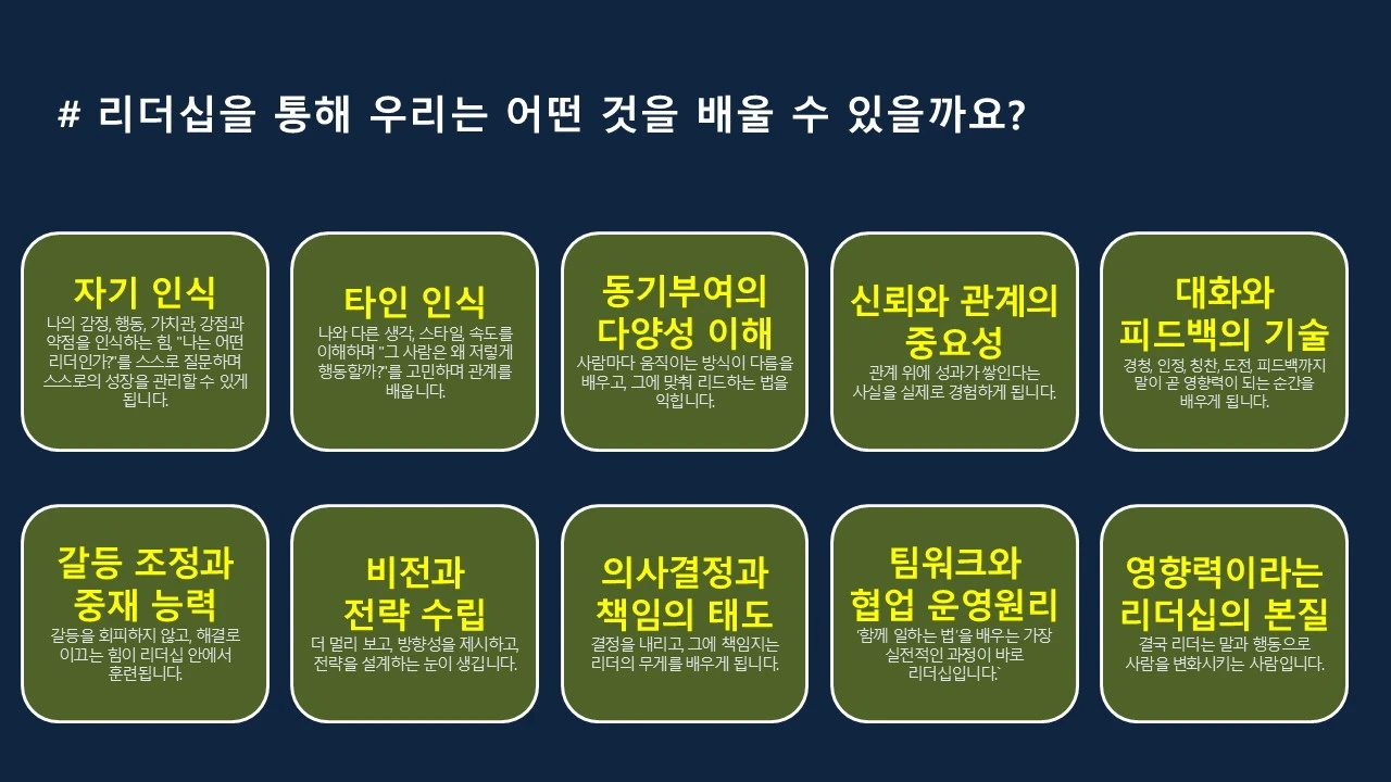 저는 이 과정에서 질문을 먼저 던지고 싶습니다. '리더를 꼭 해야만 하는 걸까?' 이미 제 글을 읽으시는 분들은 제가 어떤 말을 할지 알고 계실 겁니다. '우리는 회사 뿐만이 아니라, 가정과 교회, 친구, 모임 등 다양한 조직에 속해있고, 이 모임에서 리더와 팔로워의 역할을 동시에 수행합니다. 그리고 그 다양한 조직 중에서 유일하게 리더십을 가르쳐 주는 곳은 회사 뿐이죠. 그래서 회사에서 리더의 기회가 생겼을 때 꼭 해야 한다.' 라고 말입니다. 리더십을 학습하면 무엇이 달라질까요? 전 인간이 성숙해지는 기회를 얻을 수 있다고 말합니다. 자기 인식과 타인의 인식, 동기부여와 다양성에 대한 이해, 대화와 피드백 기술 습득, 갈등 조정과 중재 능력, 비전과 전략 수립, 의사결정과 책임을 지는 태도, 팀빌딩과 팀워크를 배양하는 스킬 등등을 배울 수 있거든요.
