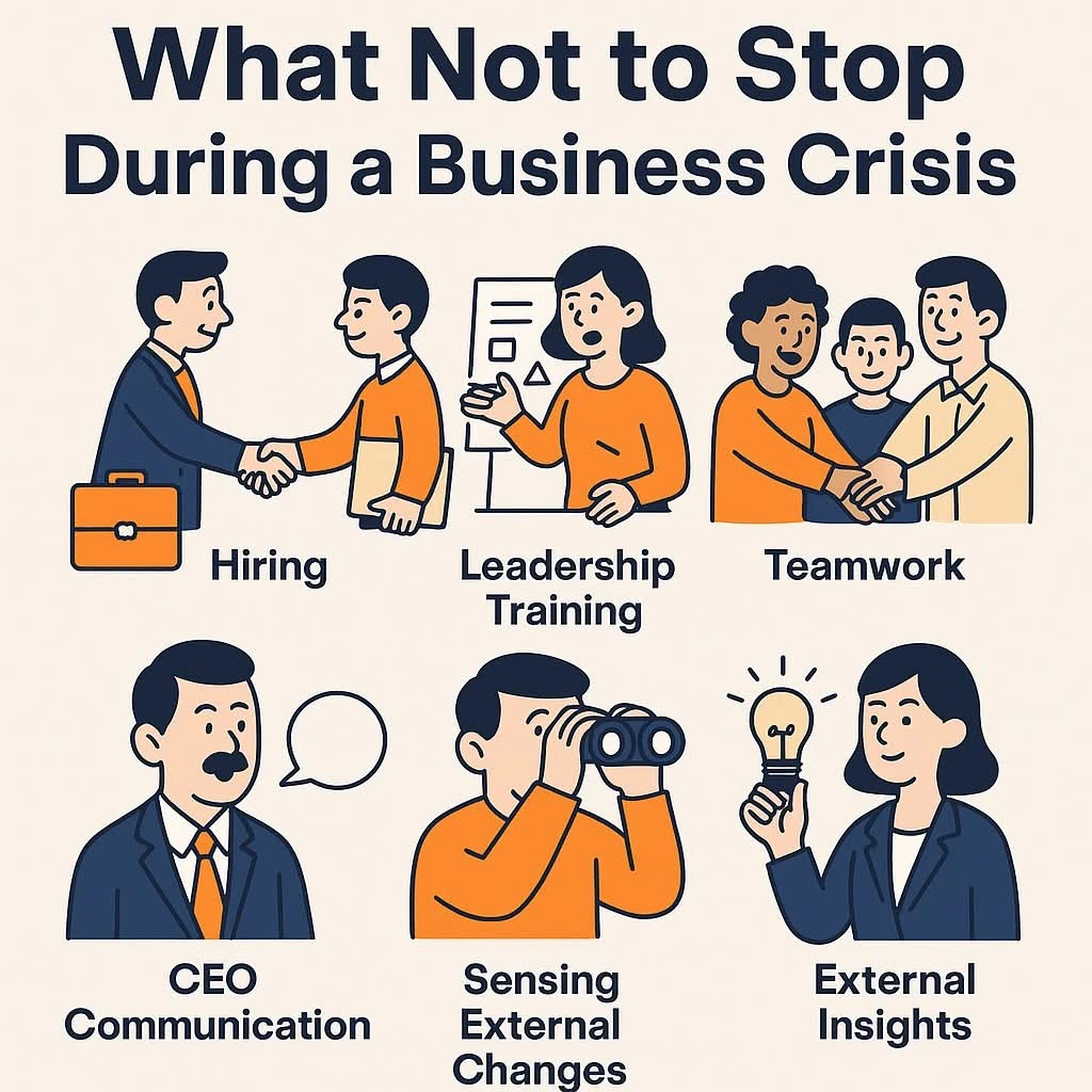다음은 제가 여러 기업 사례를 보면서 느낀, 위기 중에도 멈추면 안 되는 여섯 가지 행동입니다.