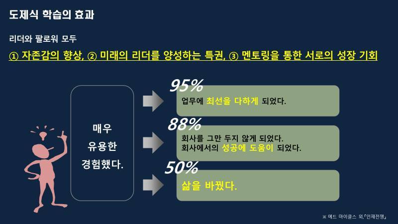 이 과정을 반복하다 보면 어느 순간 선배는 많은 후배들을 양성한 리더가 되어 있고, 후배들은 다양한 선배로 부터 받은 지식과 경험에 자신의 경험을 추가해서 자신만의 커리큘럼을 갖게 됩니다.