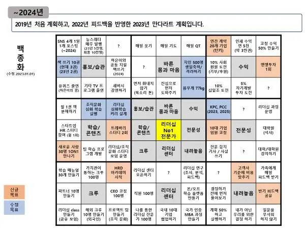 자발적으로 내 계획을 공유하면 나의 실행력이 올라간다는 것이죠. 그래서 작년에도 제 5개년 계획인 만다라트와 1년 계획인 OATE를 공유 했었습니다.