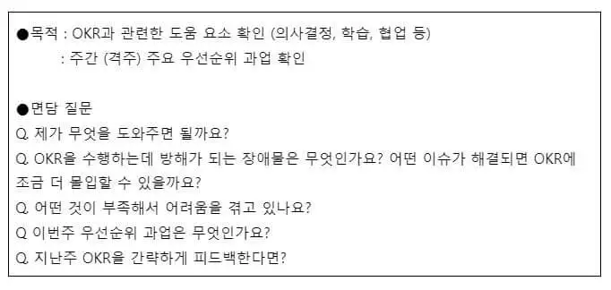 [TIP] Weekly 대화에서 가장 중요한 것은 대화의 주도권을 ‘팀원에게 준다’는 것 입니다. 즉, 팀장의 호기심을 채우기 보다 팀원이 자신의 OKR을 조금 더 잘 수행하기 위해 필요로 하는 부분을 팀장에게 먼저 공유하고, 그 이슈를 팀장이 함께 고민해 주는 대화가 되도록 해야 합니다.