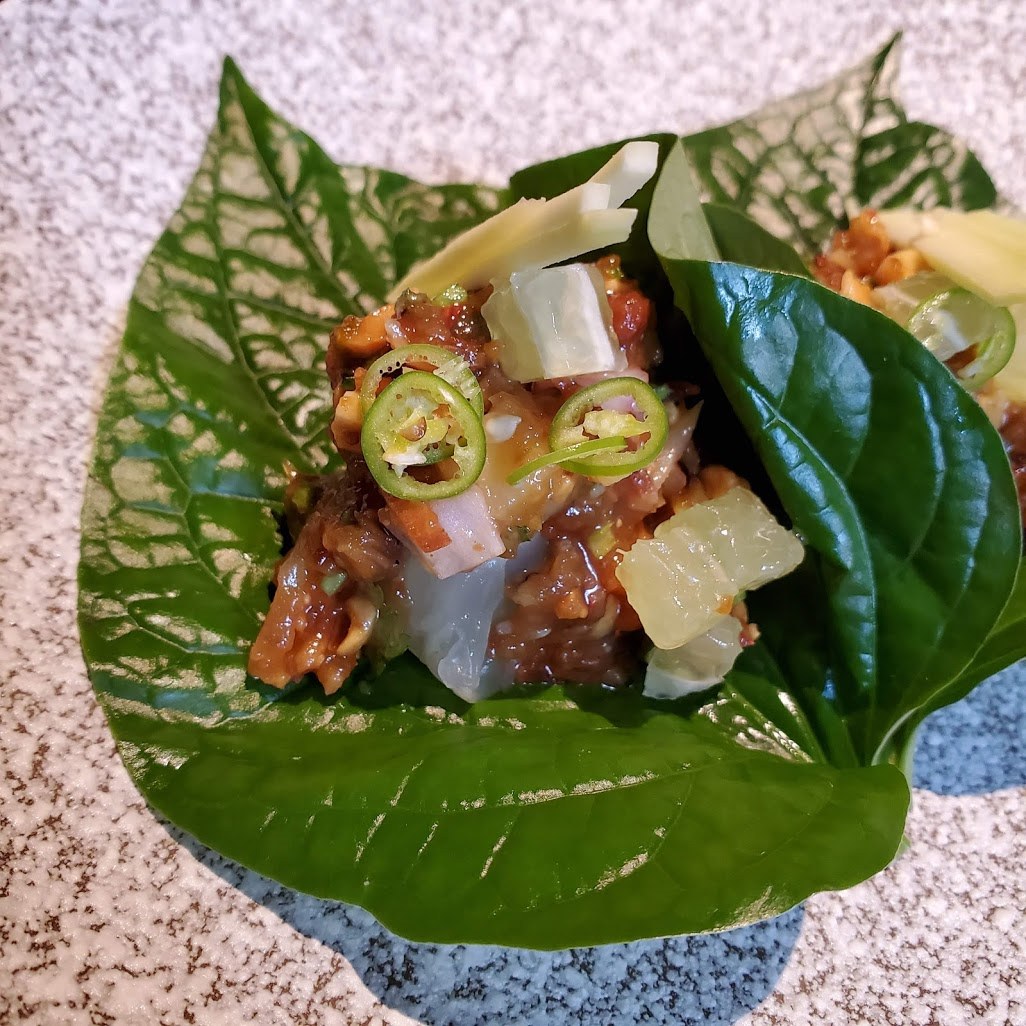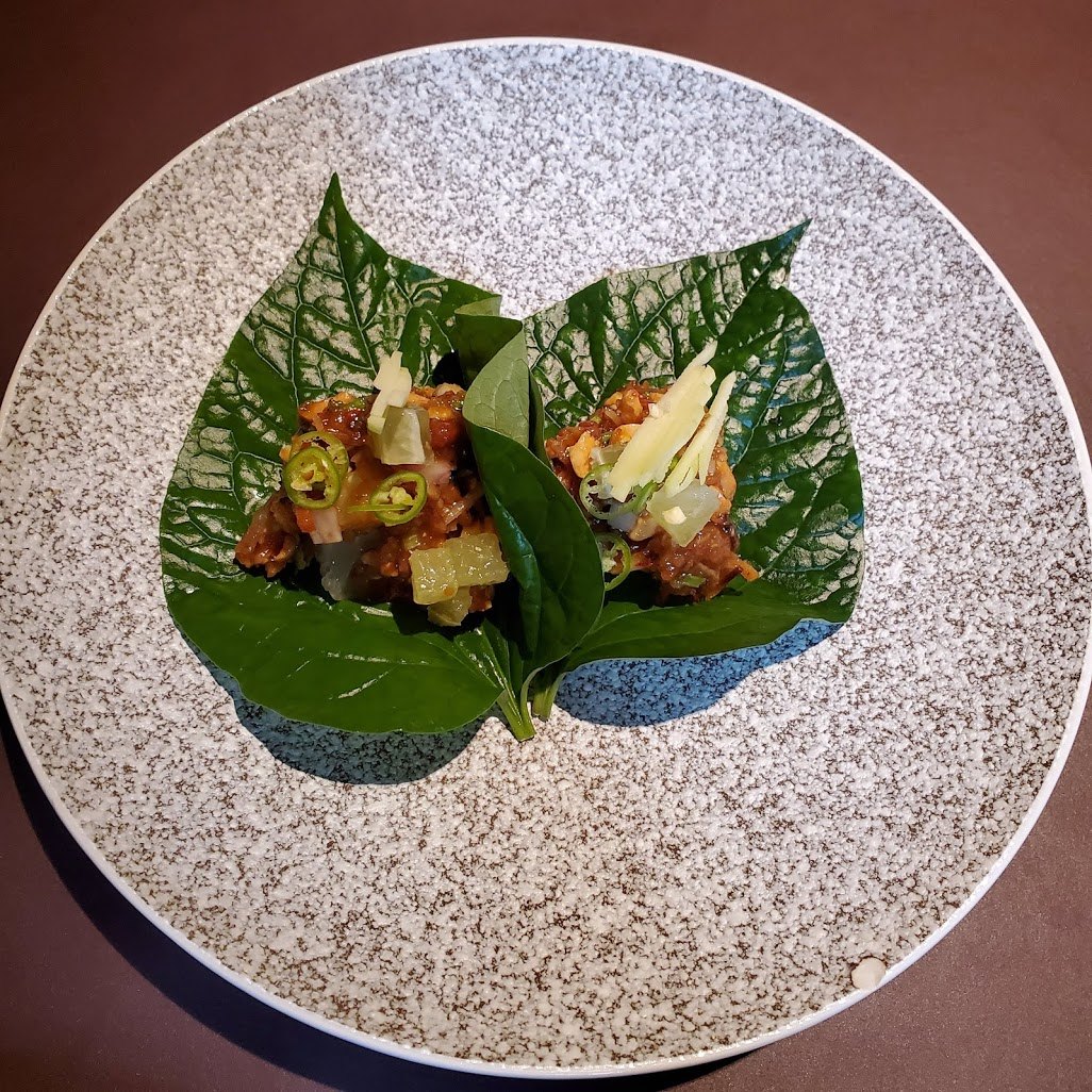 첫 번째 애피타이저. 코코넛을 볶아서 세비셰 같은 식감을 만든 쌈.