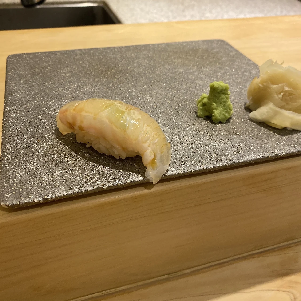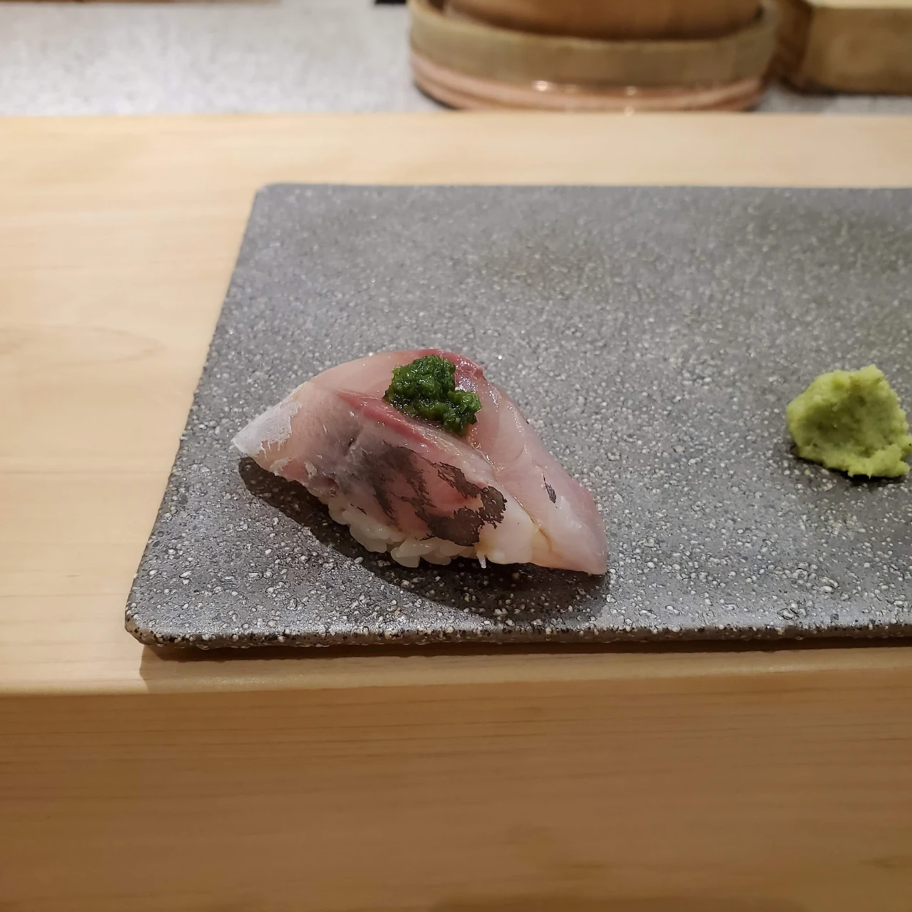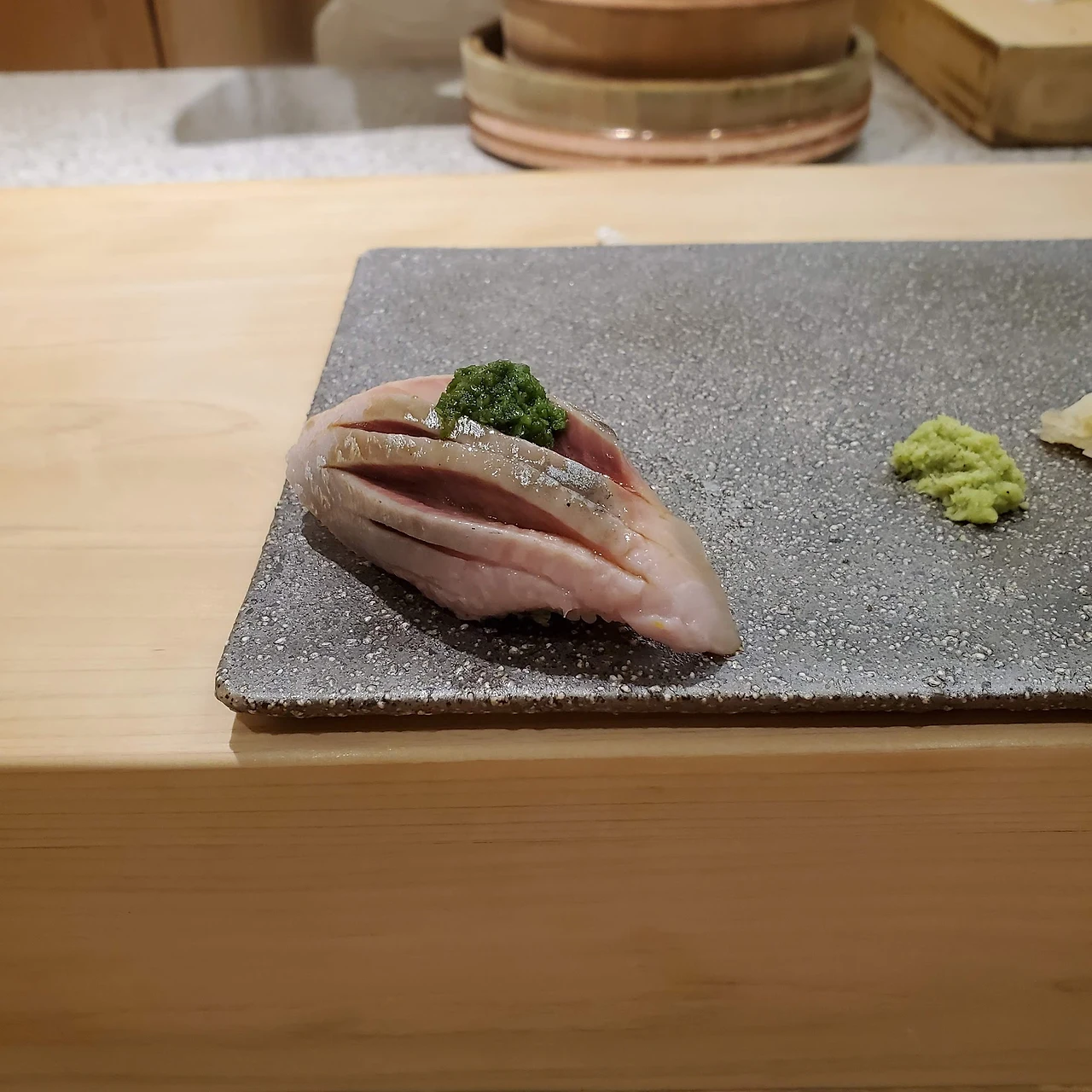 대화에 너무 열중하느라 무엇인지 잘 여쭤보지도 못했다 ㅎㅎ 대략 낙지 같은거 아니었을까 싶은데... 다음 스시는 줄무늬전갱이인가!? 아마도...