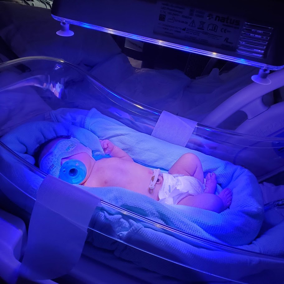 태어나서 30분 뒤의 사진(좌)과 2일차에 황달기 제거를 위한 blue ray 처치 중 사진(우)