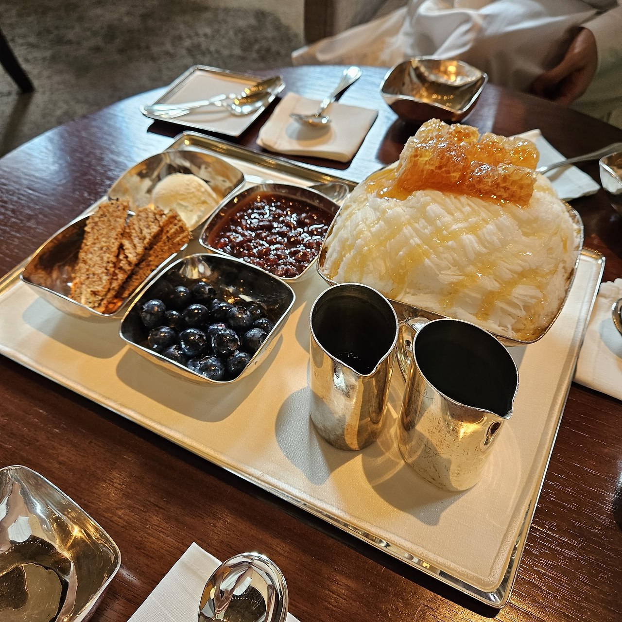 벌집 올라간 빙수에 팥, 아이스크림, 과자, 블루베리 함께 주고, 커피와 말차 소스도 준다. 매우 간단한 벌집빙수 사진 끝.