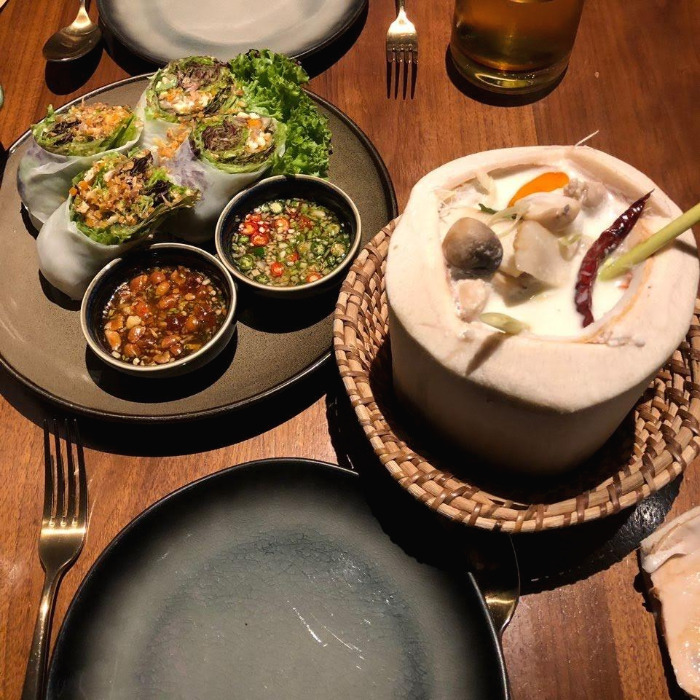 베지테리안 스프링 롤과 코코넛 수프홍콩 센트럴 랜드마크에 위치한 막막.