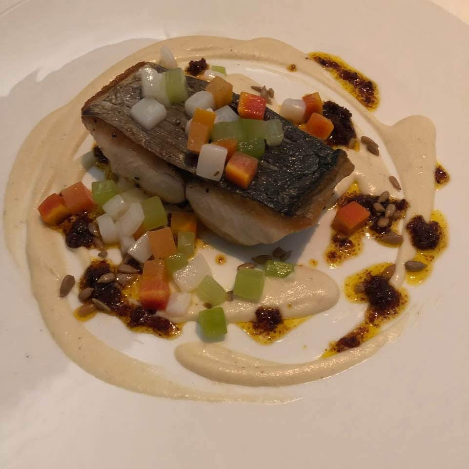 고등어구이. 아티초크 퓌레와 가르니쉬들의 아삭함이 식감을 더했다. 고등어 자체의 진한 향을 아티초크 퓌레로 감싸서 중화시키는 균형이 예술이었다.