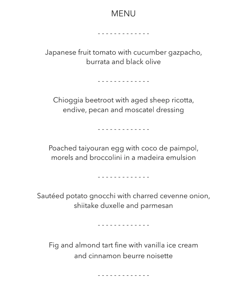 홈페이지(http://www.arcane.hk/)를 가면 메뉴가 나와있으니, 메뉴를 탐색해보고 갈 것을 추천한다. Vegeterian tasting 메뉴가 홈페이지에는 없지만 따로 존재한다. 물론 계속 바뀌는 메뉴이겠지만 일단 필자가 받은 메뉴를 리뷰 말미에 첨부하였다.