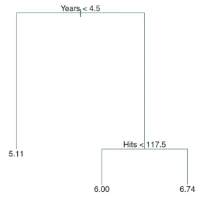 위의 그림은 야구 선수의 연봉을 예측하는 의사결정 트리 모델이에요. 의사결정 트리를 만들기 위해서는 어떤 질문을 할 것인지 그리고 그 질문들을 어떤 순서로 할 것인지 정해야 해요. 의사결정 트리의 시작을 ‘뿌리 노드’라고 하는데요, 위의 예에서 뿌리 노드인 ‘Years < 4.5’는 야구선수로 생활한 지 4.5년 보다 긴지 짧은지 질문하는 것과 같은 의미를 가져요.
