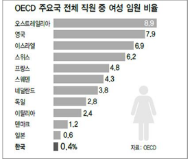 OECD 국가별 여성 임원 비율과 한국의 상황을 비교해 보면 더 암울합니다. 한국은 0.4%로 100명 중 1명도 안되는 비중으로 기업내에서 여성 임원들의 입지는 좁은 실정입니다. 이정도면 '유리천장'이 아니라 '방탄유리'라는 일각의 비아냥도 틀리지는 않은 말 같습니다.