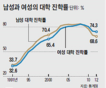 이 인구의 반인 '여성'들의 대학 진학률은 어떨까요? 통계청 자료에 의하면 이미 여성 대학 진학률은 2012년 74.3%로 남성 대학 진학률을 앞지른 상황입니다.