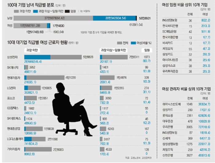 100대 기업 여성 과장이상은 8.7%, 임원은 0.04%에 불과합니다. 10대 대기업 직급별 여성 근로자를 보면 삼성전자 과장 미만이 45%로 매우 괄목할 만한 지표를 보이고 있습니다. 하지만 과장 이상은 7.1% 수준이군요.그래도 나머지 기업들에 비해서는 나은 편으로 보입니다.타 기업들의 여성 근로자 비율은 매우 낮은 실정입니다. 여성 임원 비율이나 관리자 비율이 높은 10개 기업을 보면 금융업과 서비스업 위주의 산업군에서 높은 비율을 차지하는 것으로 나타났습니다.