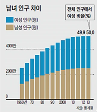 통계청 자료를 보면 2013년에 이미 한국의 인구 중에 여성 비율을 50%를 넘어섰습니다. 한반도 영토에 살아가고 있는 사람들 중 '반'이 여성라는 사실은 굳이 통계를 보지 않더라도 잘 알 수 있는 사실입니다. 국가의 경쟁력 요소중에 중요한 것 중에 첫번째가 인구수이고 그 인구의 반이 '여성'라면 '여성 인구'도 국가의 경쟁력을 수반하는 중요한 자원이라는 뜻이겠지요.