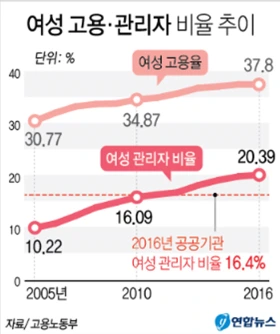고용노동부 자료에 의하면 한국의 고용률은 37.8%이고 그 중에 관리자 비율은 20.39%입니다. 100명중에 약 38명은 경제 활동에 참여하고 있으며, 그 중 약 21명은 관리자로 역할을 수행하고 있다고 하네요. 이것을 배수를 좀 줄여볼까요? 10명중에 3.8명이 취업을 하고 있고, 2.1명이 여성 관리자라는 뜻입니다. 제 주위에는 여성 상사가 없어서인지 이 통계조차도 업종별 평균이어서 거리감이 느껴지는 숫자군요. 물론 이 통계는 학력/나이와 무관하게 전체 여성인구의 고용율을 나타내고 있습니다.