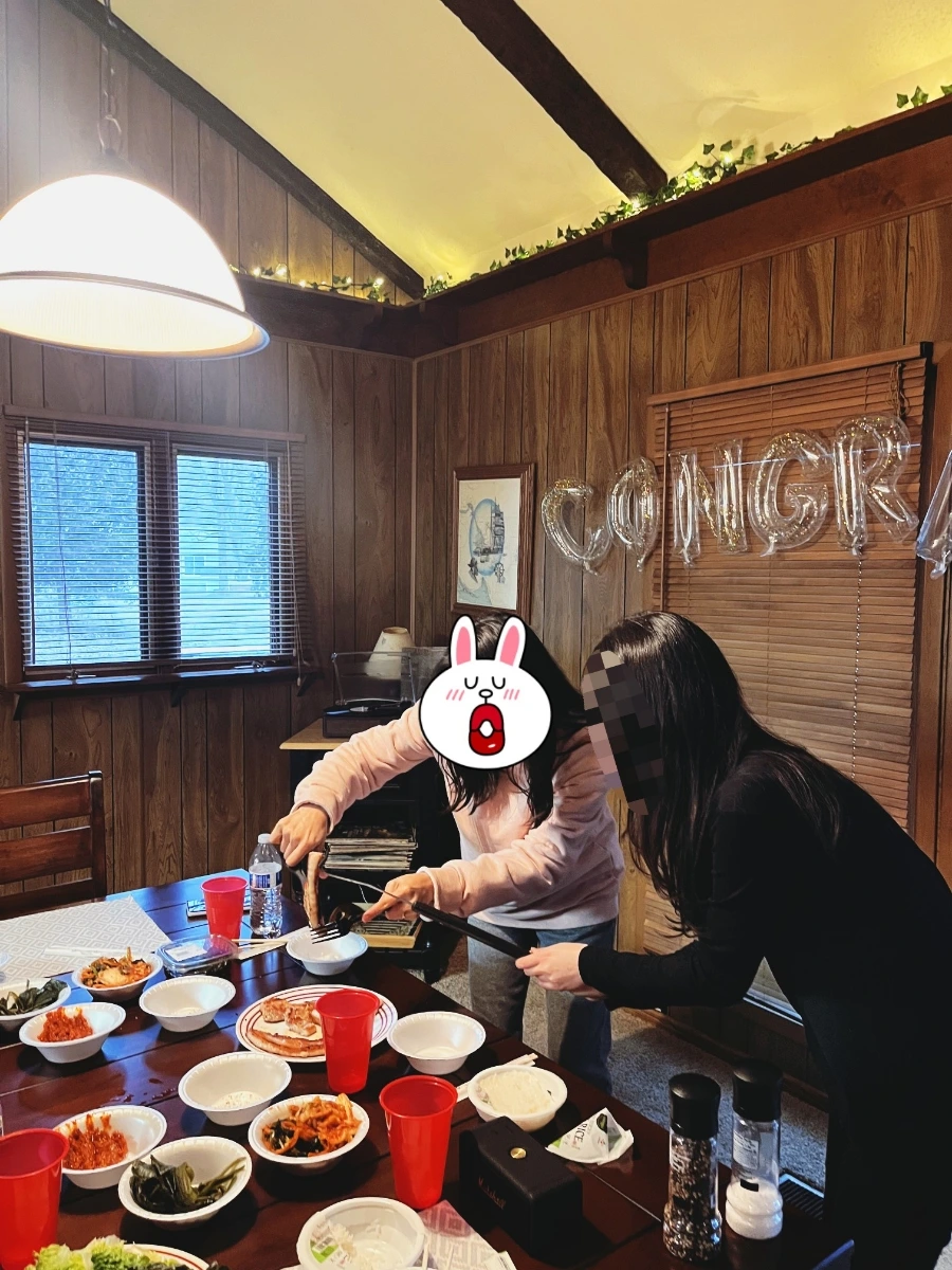 그리고 대망의 삼겹살 바베큐 파티. 남자팀이 눈을 맞으며 고기를 굽느라 너무 고생했다. 야외 그릴에서 구워서 그런지 미국에 와서 먹은 수많은 삼겹살 중에 가장 맛있었다. 마트에서 명이나물과 김치도 잔뜩 사 갔는데, 쌈장에 찍어 먹는 순간 눈이 띠용- 튀어나올 뻔했다. 도톰한 삼겹살이 겉은 바삭하게 익고 속에는 육즙을 가득 머금어서, 씹는 순간 바삭함 속에서 육즙이 터져 나오는 듯한 식감이었다. 역시 놀러 나와서 야외에서 구워 먹는 삼겹살이 최고다.
