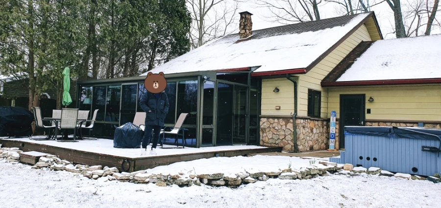 캐빈이 생각보다 마음에 쏙 들었다. 호숫가를 바라볼 수 있게 통유리로 설치되어 있었다. 따뜻한 물이 퐁퐁 솟는 야외 사우나도 있었다. 미국인들, 풍류는 기가 막히게 향유하는구나 싶다. 날씨가 따뜻했으면 한 시간이고 호수를 바라보며 멍을 때렸을 텐데, 테라스도 꽤나 추워서 조금 보다가 얼른 실내로 도망치고, 또 나와서 잠시 보다가 후퇴하고를 반복했다. 그래도 비수기 겨울에 와서 저렴하게 머물 수 있었다.