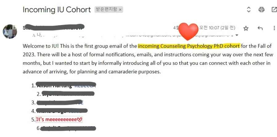함께 입학하게 될 코호트 동기들이 모두 정해졌다. 학과 입학 담당 교수님이 동기 6명을 소개해 주는 이메일을 보내주었다. 아주 모험적인 새 여정이 시작되는 게 실감이 나서 설레고 떨렸다. 어떤 친구들과 공부를 하게 될지 궁금하다. 다만, 외국인은 나뿐인 것 같아서 조금 걱정도 된다. 미국 아이들 틈바구니에서 잘 적응할 수 있을지 모르겠다.