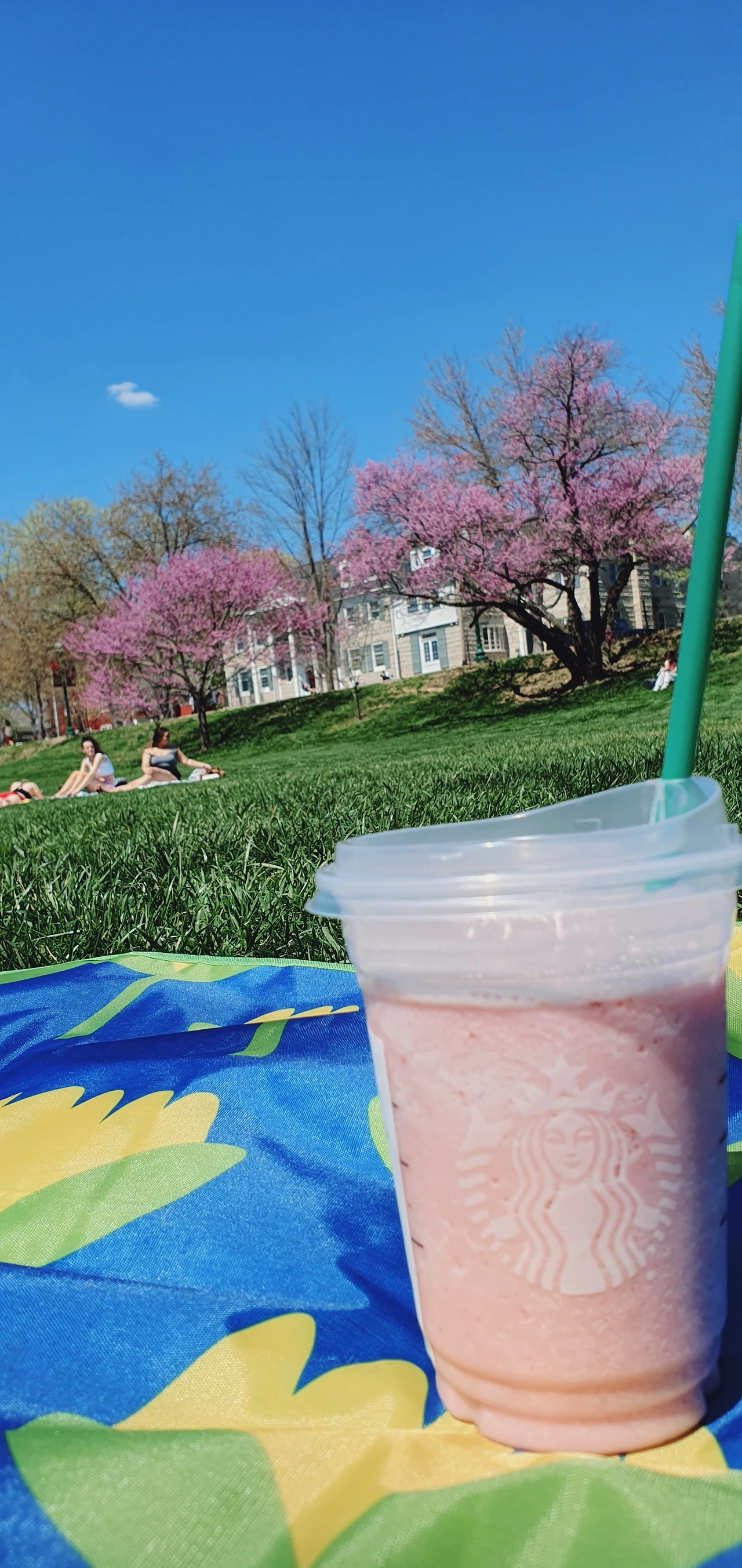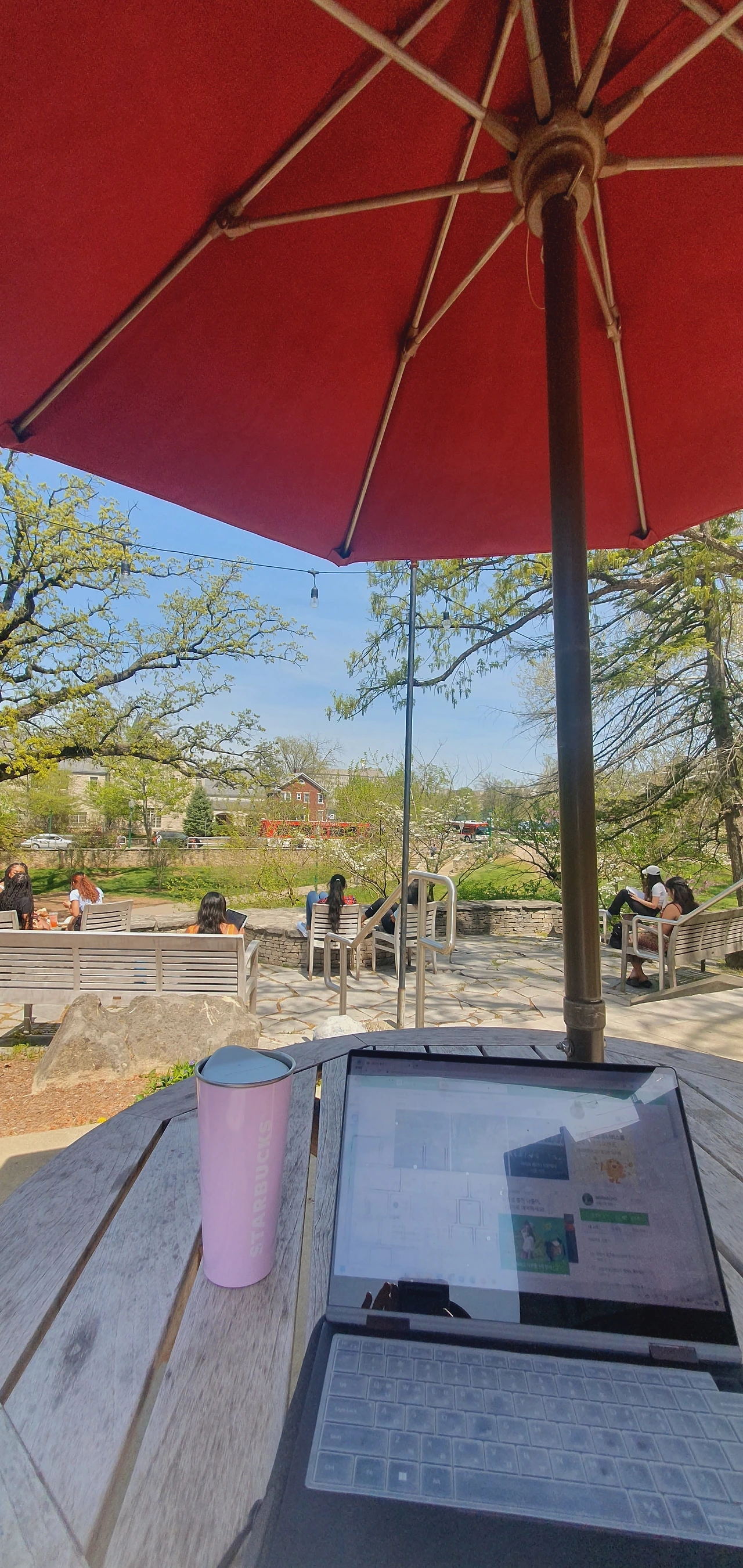 나 홀로 피크닉도 빼놓을 수 없다. 따뜻하고 햇살 좋은 날이면, 캠퍼스 잔디밭에는 미국 아이들의 피크닉의 향연이 펼쳐진다. 올림픽공원의 딸로서, 피크닉은 양보 못한다. 혼자여도 질 수 없다. 돗자리 펴고, 딸기 크림 프라푸치노 하나 끼고 드러누우면 되는 거다.