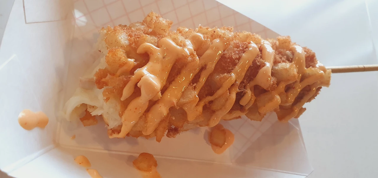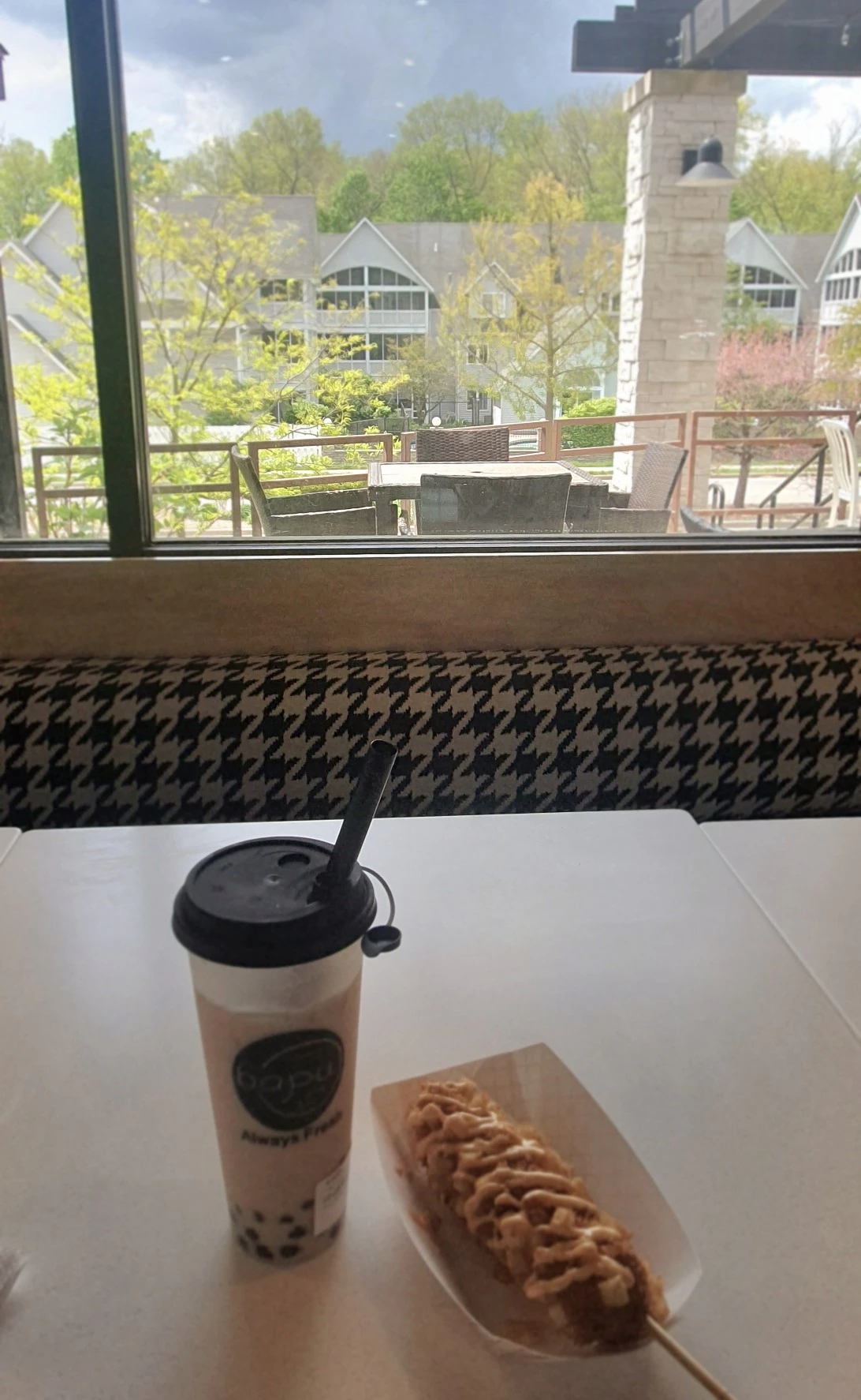 얼그레이 버블티와 감자 핫도그를 주문하고 기다렸다. 버블티는 미디엄 사이즈를 주문했는데, 미디엄 용기가 없어서 그냥 라지 사이즈로 줬단다. 예상 못 한 행운에 기분이 좋아졌다. 따끈따끈 갓 튀긴 핫도그와 행운의 버블티를 가지고 창가 뷰가 제일 예쁜 자리에 앉았다. 감자 박힌 하프앤하프 핫도그는 언제 먹어도 너무 맛있다. 맛있는 것들로 요기를 하니 기분이 좋았다.